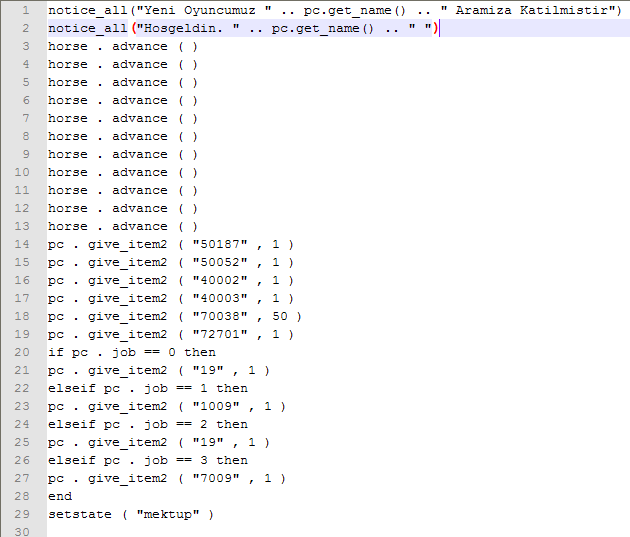 notice_all("Hosgeldin. " .. pc.get_name() .. " ") Daha sonra kayıt edip reboot atıyorsunuz. Aktif olacaktır !